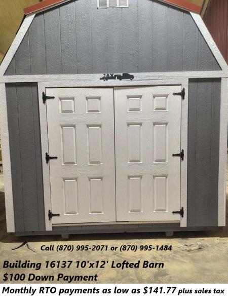 This building has a low down payment of $100.00. After the deposit is made we offer free delivery up to 50 miles from the Jonesboro lot.